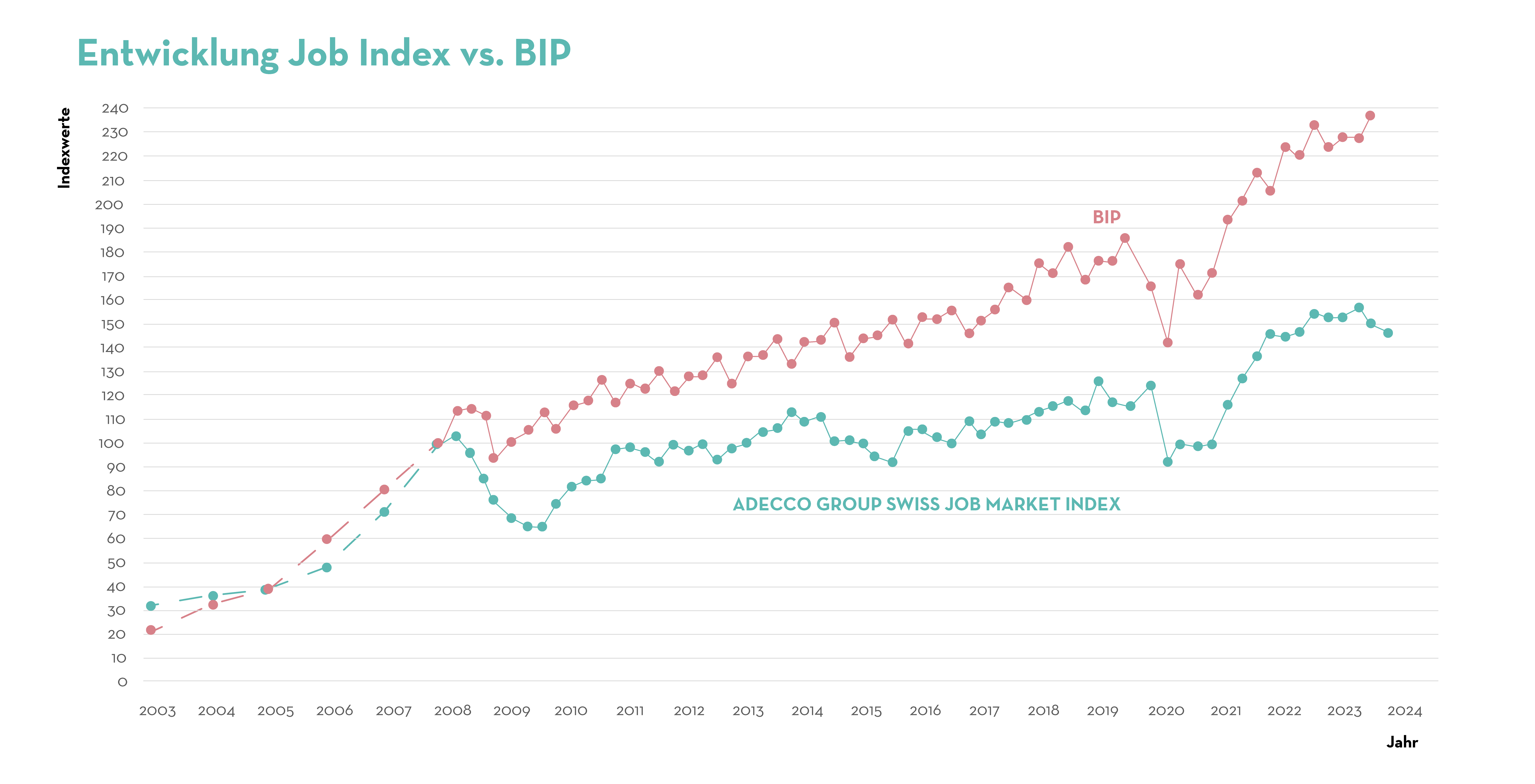 Den hier präsentierten Resultaten liegen die Job Index Daten (Adecco Group Swiss Job Market Index) für den Zeitraum vom 3. Quartal 2014 bis dem 1. Quartal 2024 zugrunde. Diese Quartalsdaten umfassen zum einen Daten aus den 12 grössten Schweizer Stellenbörsen. Zum anderen basieren sie auf Stellenausschreibungen aus knapp 1’500 Unternehmenswebseiten, die eine für die Schweiz repräsentative, nach Branche und Unternehmensgrösse geschichtete Zufallsstichprobe darstellen.