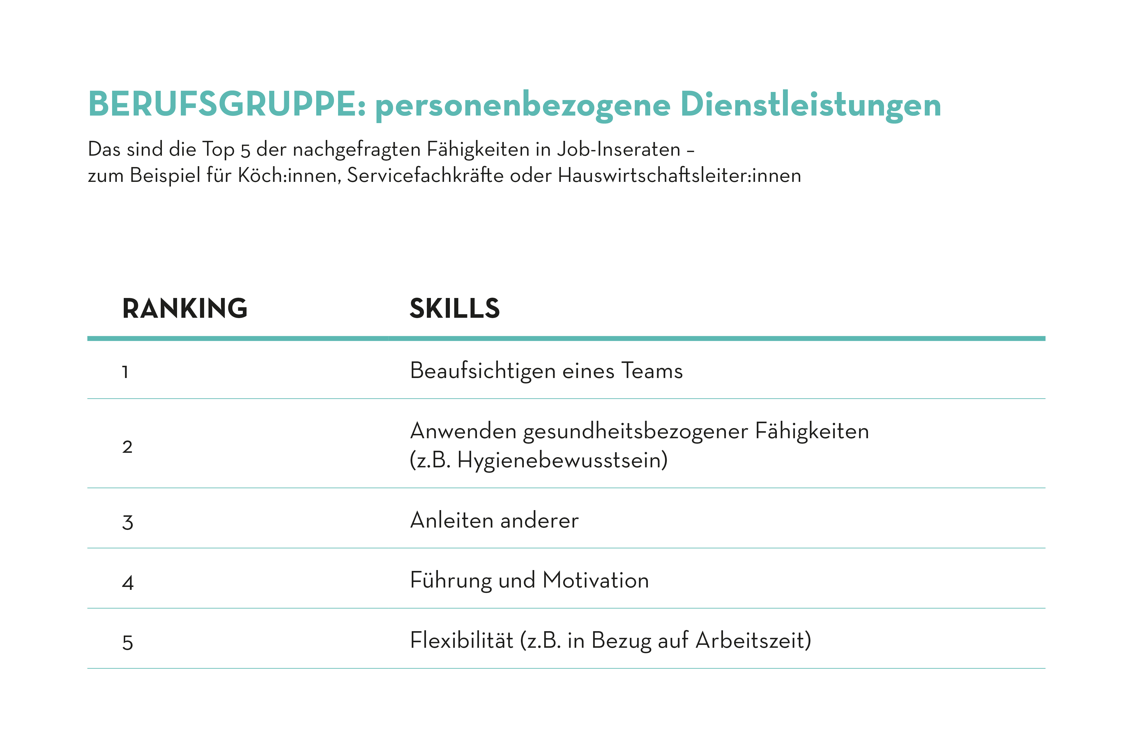 Neben Führungsfähigkeiten legen Arbeitgebende besonderen Wert auf Mitarbeitende, die über ein hohes Mass an Sauberkeit, körperliche Belastbarkeit und ein ausgeprägtes Bewusstsein für Hygiene verfügen (gesundheitsbezogene Fähigkeiten und Kompetenzen). Diese Fähigkeiten sind entscheidend für die Aufrechterhaltung eines sicheren und produktiven Arbeitsumfeldes. Zugleich ermöglicht eine gute körperliche Verfassung den Mitarbeitenden, den physischen Herausforderungen ihrer Arbeit, wie etwa lange Stehzeiten in Serviceberufen, effektiv zu begegnen. Darüber hinaus ist von den Bewerbenden, gleich wie bei den Gesundheitsspezialisten, ebenfalls ein bestimmtes Mass an Flexibilität gefragt.