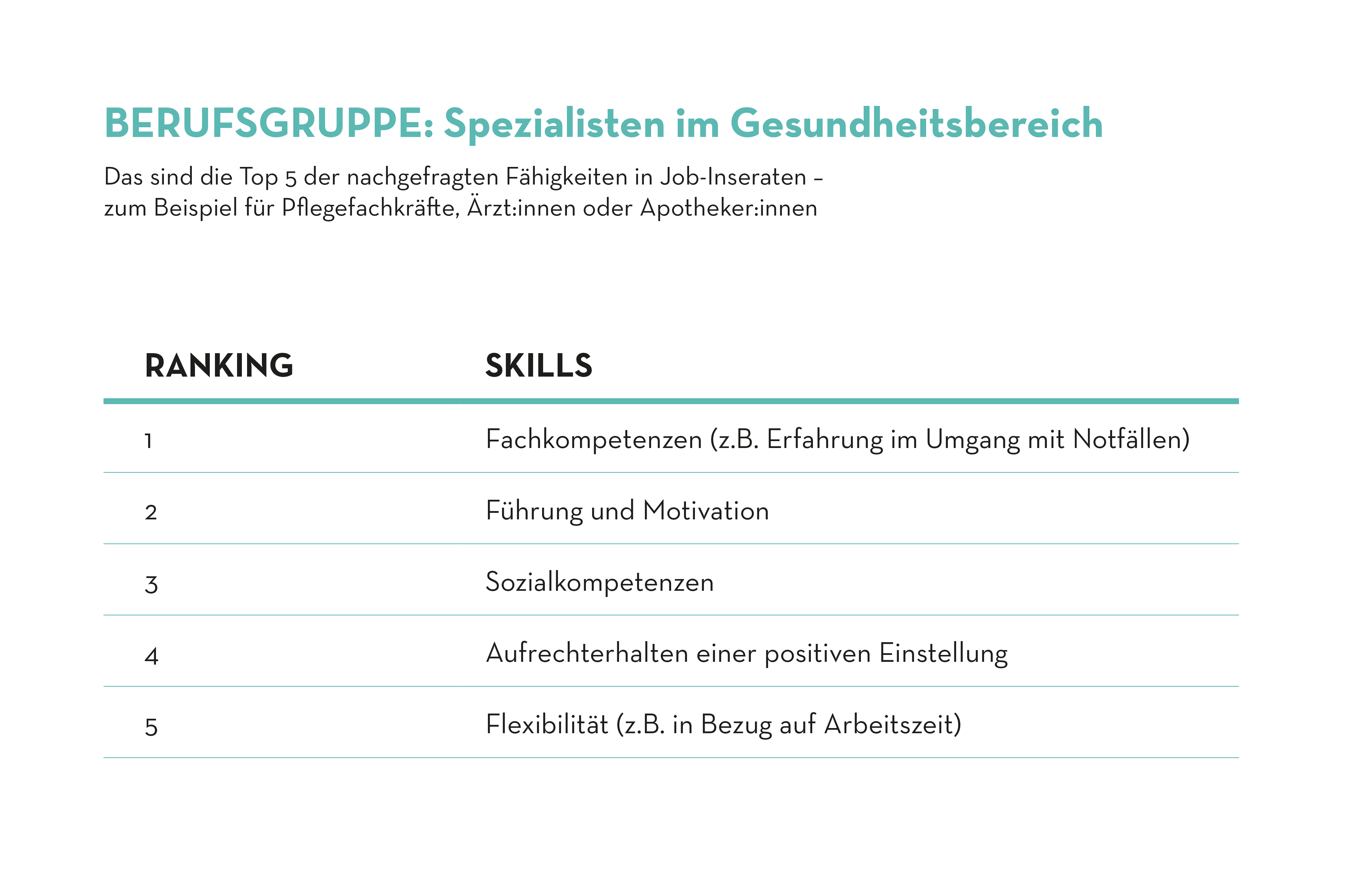 Zur Berufsgruppe der Spezialist:innen in Gesundheitsberufen zählen unter anderem Pflegefachkräfte, ärztliches Fachpersonal und Apotheker:innen. An oberster Stelle der wichtigsten Skills steht in dieser Berufsgruppe eine fundierte Fachkompetenz – also die umfassende Beherrschung des Fachgebiets. Zum Beispiel muss eine Notärztin sowohl über sattelfeste theoretische Kenntnisse als auch praktische Erfahrung mitbringen, um die Symptome eines Herzinfarkts diagnostizieren und entsprechend intervenieren zu können. Auch Führungskompetenzen sind gefragt. In dieser Berufsgruppe erfolgt die Arbeit häufig im Teamkontext. So erfordern chirurgische Eingriffe die koordinierte Zusammenarbeit zwischen Chirurg:innen, Pflegefachkräften und Anästhesist:innen. Dadurch können sich, beispielsweise, Chirurg:innen mit Führungsqualitäten und -erfahrung einen entscheidenden Vorteil verschaffen.