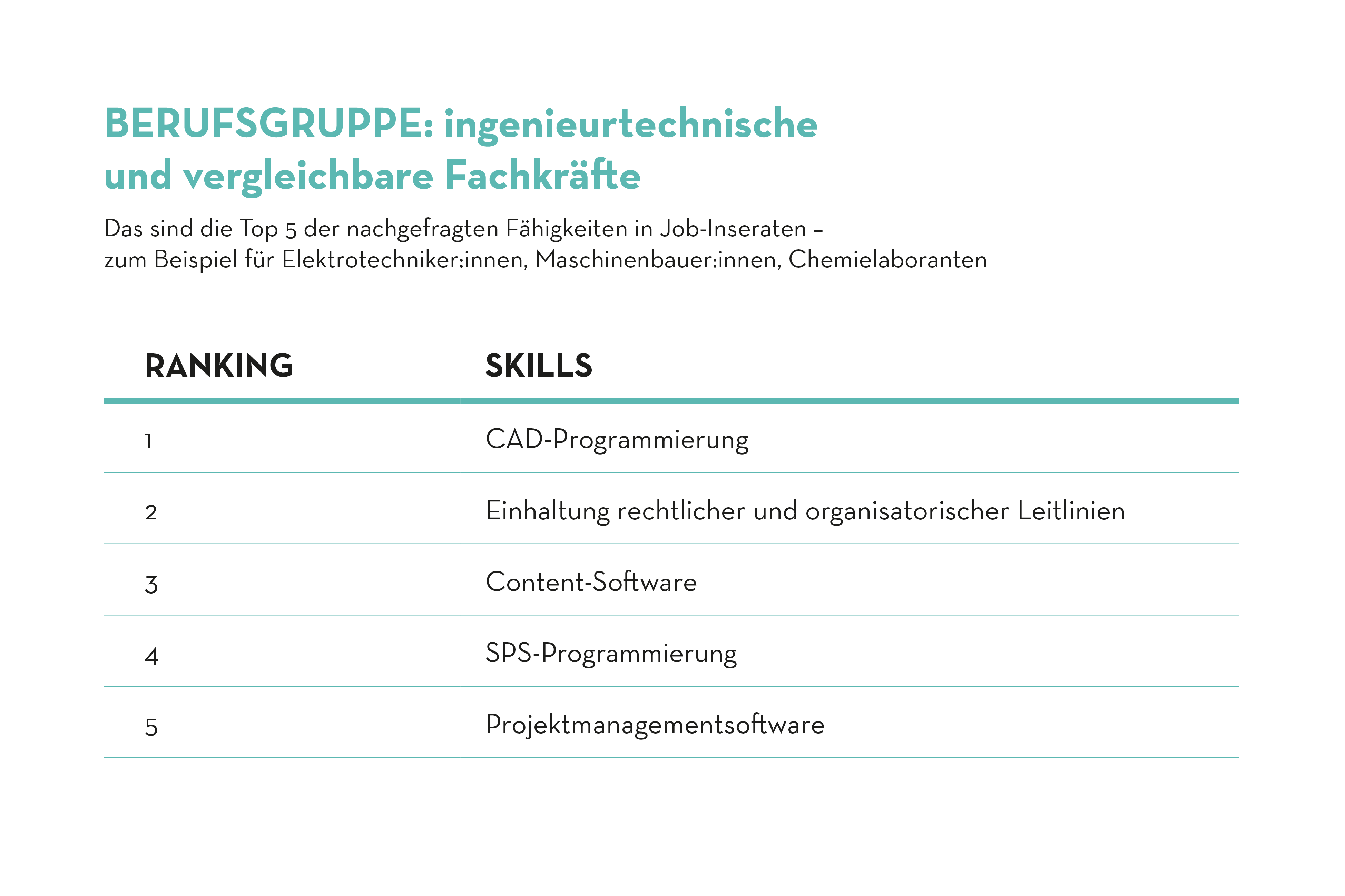 Dabei zeigte sich, dass Führungskompetenzen über verschiedene Berufsgruppen hinweg besonders stark gesucht werden. Zudem wurde deutlich, dass IT-Skills nicht ausschliesslich in IT-Berufen, sondern auch in technischen Berufen wichtige Kompetenzen darstellen.
