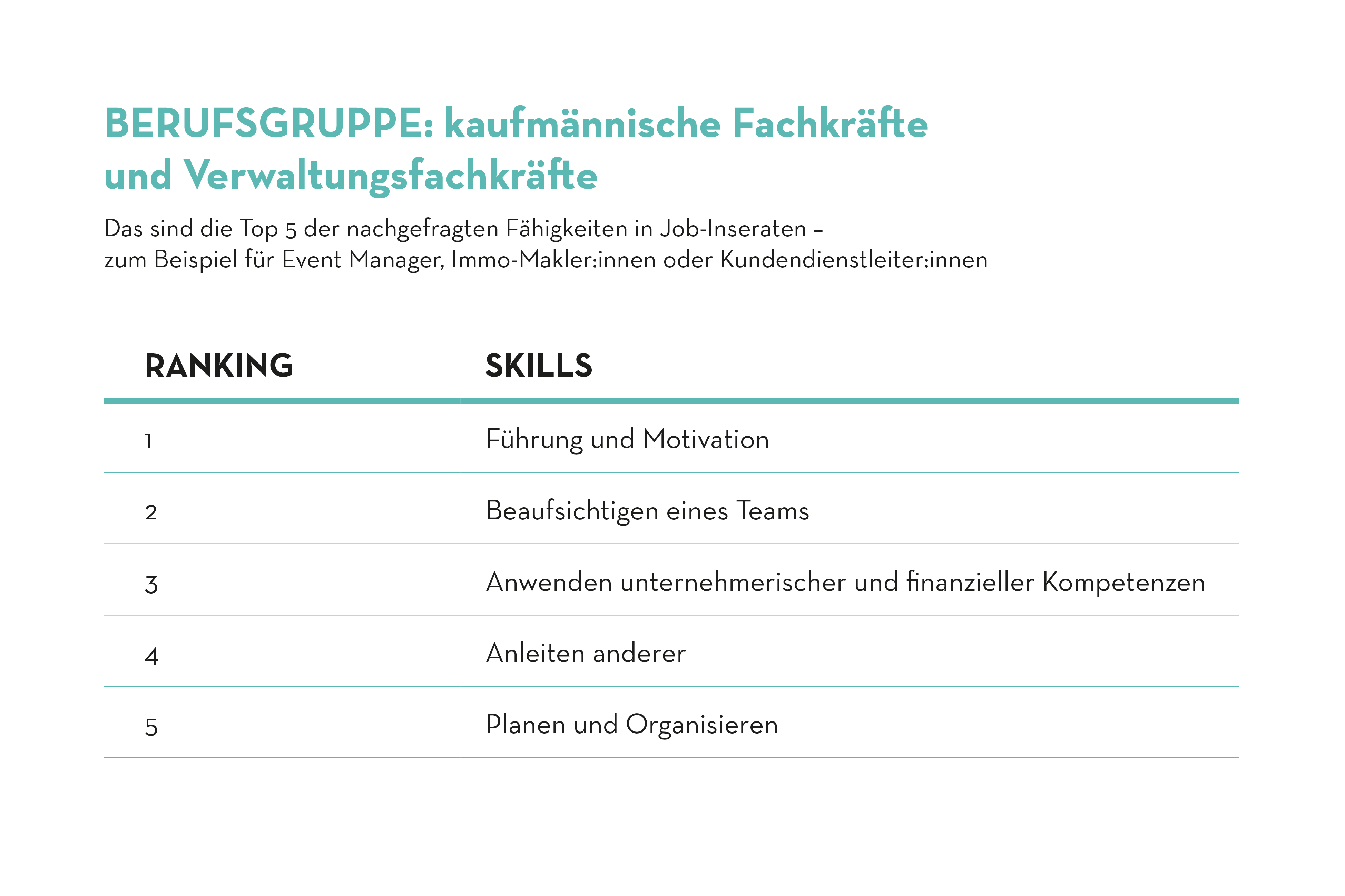 Die Berufsgruppe der kaufmännischen Fachkräfte und Verwaltungsfachkräfte beinhaltet Berufe wie etwa Event Manager, Kundendienstleiter:innen oder Immobilienmakler:innen. Arbeitgeber dieser Berufsgruppe legen besonderen Wert auf Führungskompetenzen und -qualitäten, da diese Berufe oft die Verantwortung über Teams oder Projekte übernehmen müssen. Dadurch haben Bewerbende mit nachweislicher Führungserfahrung einen deutlichen Vorsprung gegenüber anderen Kandidat:innen.