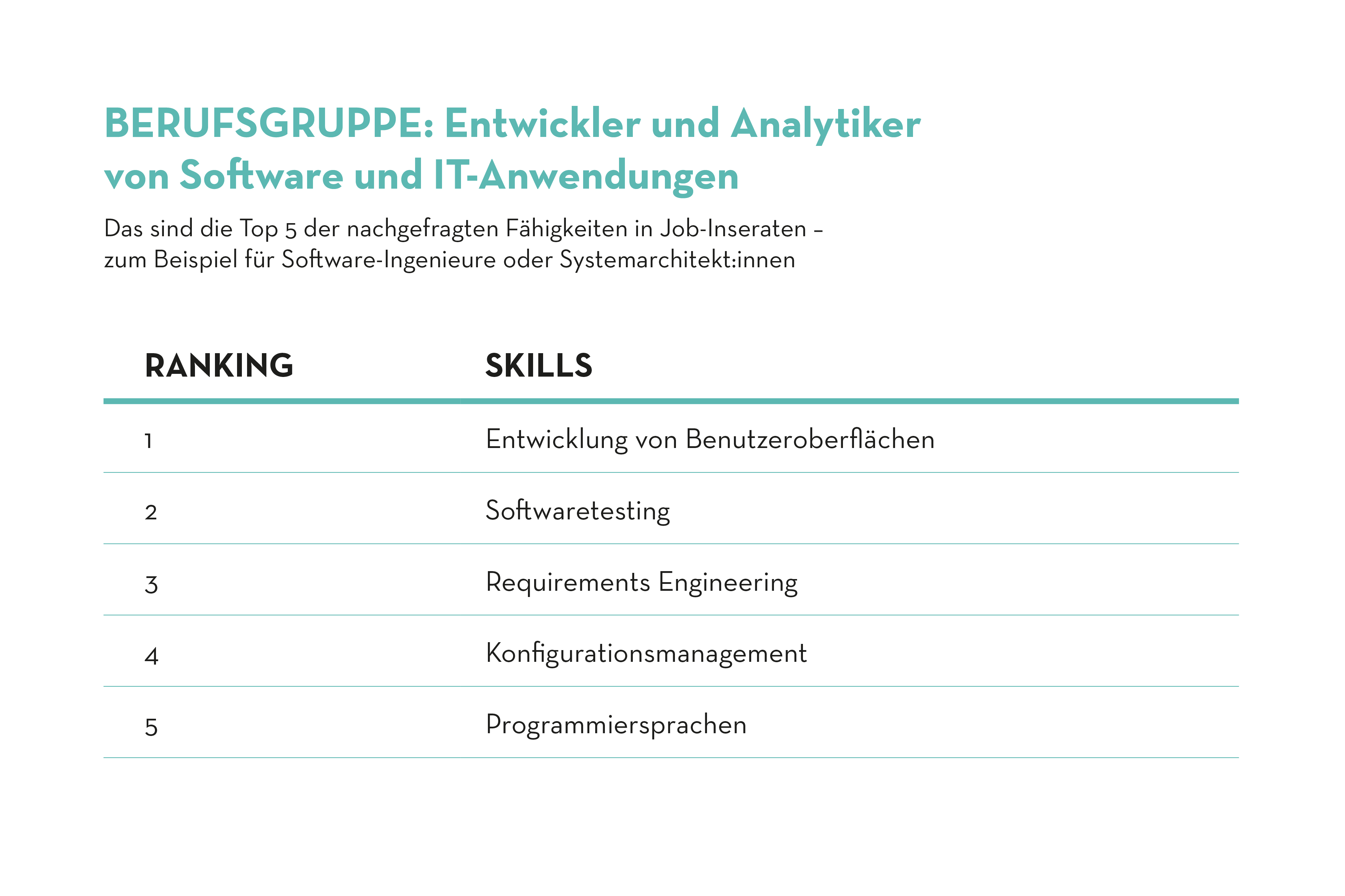 Die Berufsgruppe der Entwickler:innen und Analytiker:innen von Software und IT-Anwendungen umfasst diverse IT-Spezialisten wie beispielsweise Systemarchitekt:innen, Softwareingenieur:innen und Test Automation Engineers. An der Spitze des Skill-Rankings stehen in dieser Berufsgruppe Fähigkeiten und Kenntnisse im Design von grafischen Benutzeroberflächen. Besonders gefragt sind hier Kenntnisse in Responsive Design, UI (User Interface) und UX (User Experience). Unverzichtbar für Arbeitgeber dieser Berufsgruppe sind auch Skills in Softwaretesting und im Requirements Engineering - dem Prozess, bei dem ermittelt wird, was eine neue Software oder ein System können soll, basierend auf den Wünschen und Bedürfnissen der Nutzer. Diese Skills sind entscheidend, um Nutzerbedürfnisse in technische Spezifikationen zu überführen und die Entwicklung fehlerfreier Anwendungen zu gewährleisten.