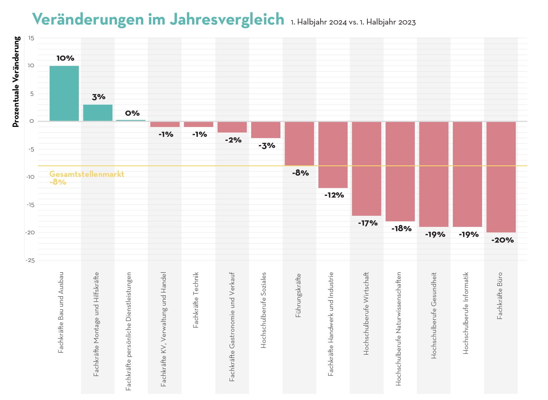 Zwar verzeichnen die Fachkräfte Bau und Ausbau aktuell einen Anstieg von 10 Prozent bei den offenen Stellen im Vergleich zum ersten Halbjahr des Vorjahres, doch im Vergleich zum zweiten Halbjahr 2023 nehmen die Vakanzen um 4 Prozent ab. Damit ist der steile Wachstumstrend, den diese Berufsgruppe seit 2021 aufweist, vorerst beendet. Dieser Wachstumstrend wurde insbesondere durch die Entwicklung der Untergruppe Bau- und Ausbaufachkräfte (z. B. Schreiner:innen, Dachdecker:innen oder Kälteanlagebauer:innen) gestützt, welche nach dem Erreichen eines historischen Hochs im zweiten Halbjahr 2023 in diesem Halbjahr erstmals seit dem ersten Halbjahr 2021 eine Abnahme der Stellenausschreibungen verzeichnet.