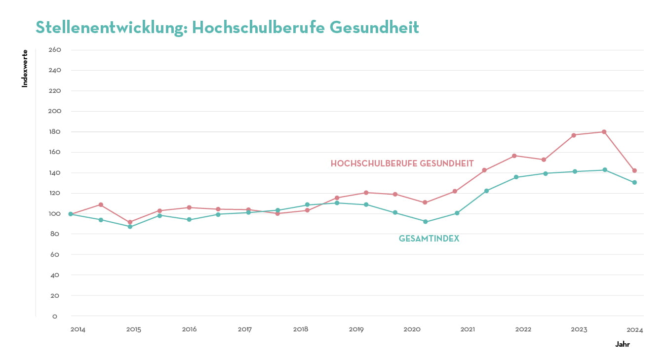 Bei den Hochschulberufen Gesundheit ist im ersten Halbjahr 2024 erstmals seit Jahren wieder ein deutlicher Rückgang bei den offenen Stellen zu sehen. Im Vergleich zum ersten Halbjahr 2023 verzeichnet diese Berufsgruppe einen Rückgang der ausgeschriebenen Stelleninserate um 19 Prozent. Sämtliche Untergruppen dieser Berufsgruppe verzeichnen einen Rückgang im Stellenangebot, wobei die Untergruppe der Pflegefachkräfte besonders betroffen ist.