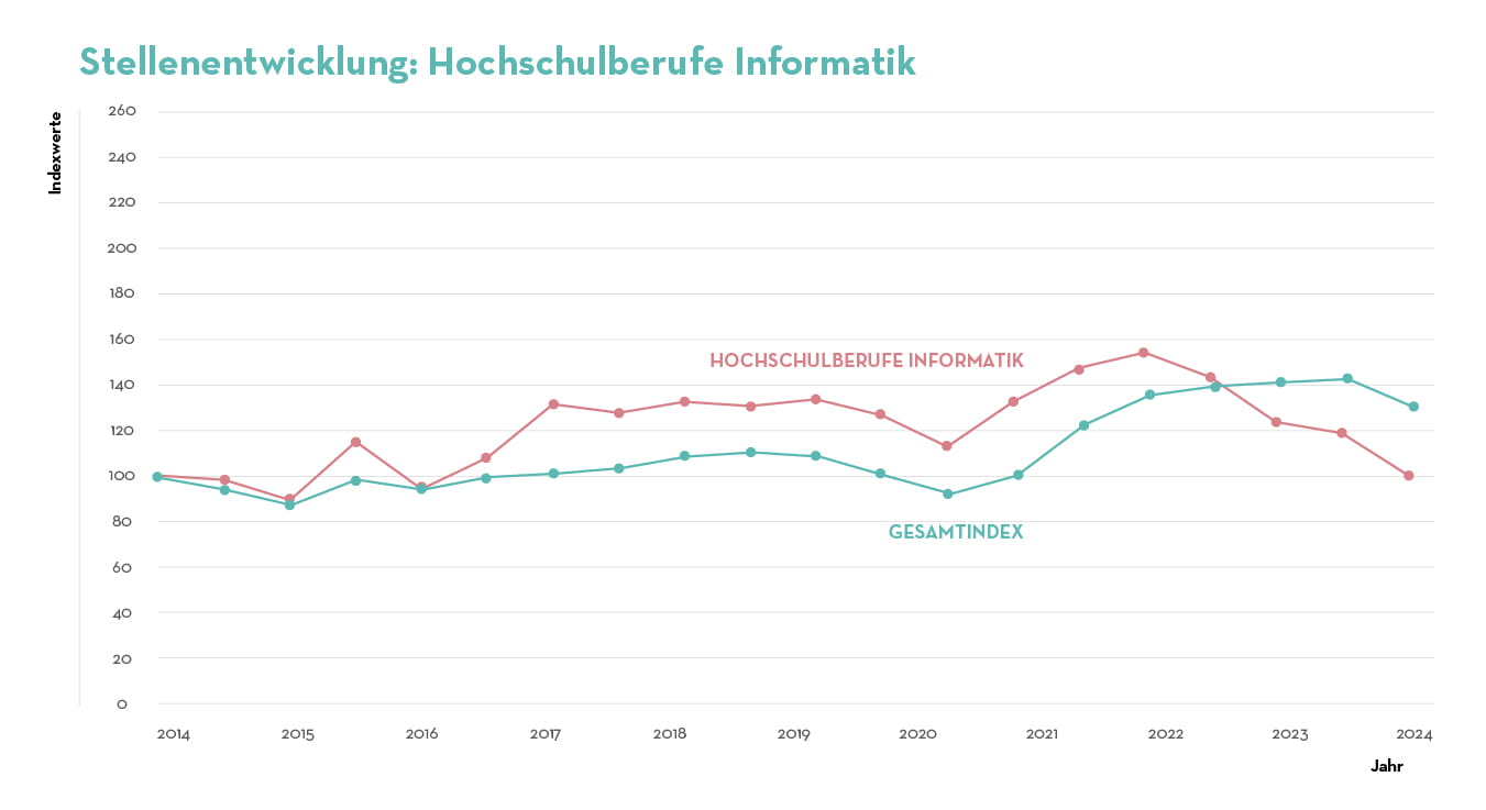 Seit dem zweiten Halbjahr 2022 verzeichnen die Hochschulberufe Informatik einen negativen Trend in der Stellenentwicklung. Dieser Trend setzt sich auch in diesem Halbjahr fort, sodass aktuell 19 Prozent weniger Stellen im Vergleich zum ersten Halbjahr 2023 ausgeschrieben sind. Eine mögliche Erklärung für die Abnahme des Stellenangebots könnte sein, dass die hohen Zinsen zu steigenden Kosten für IT-Projekte führen und die schwache Wirtschaftsentwicklung Investitionsvorhaben hemmt, was sich beides negativ auf die Nachfrage nach IT-Fachkräften auswirkt.