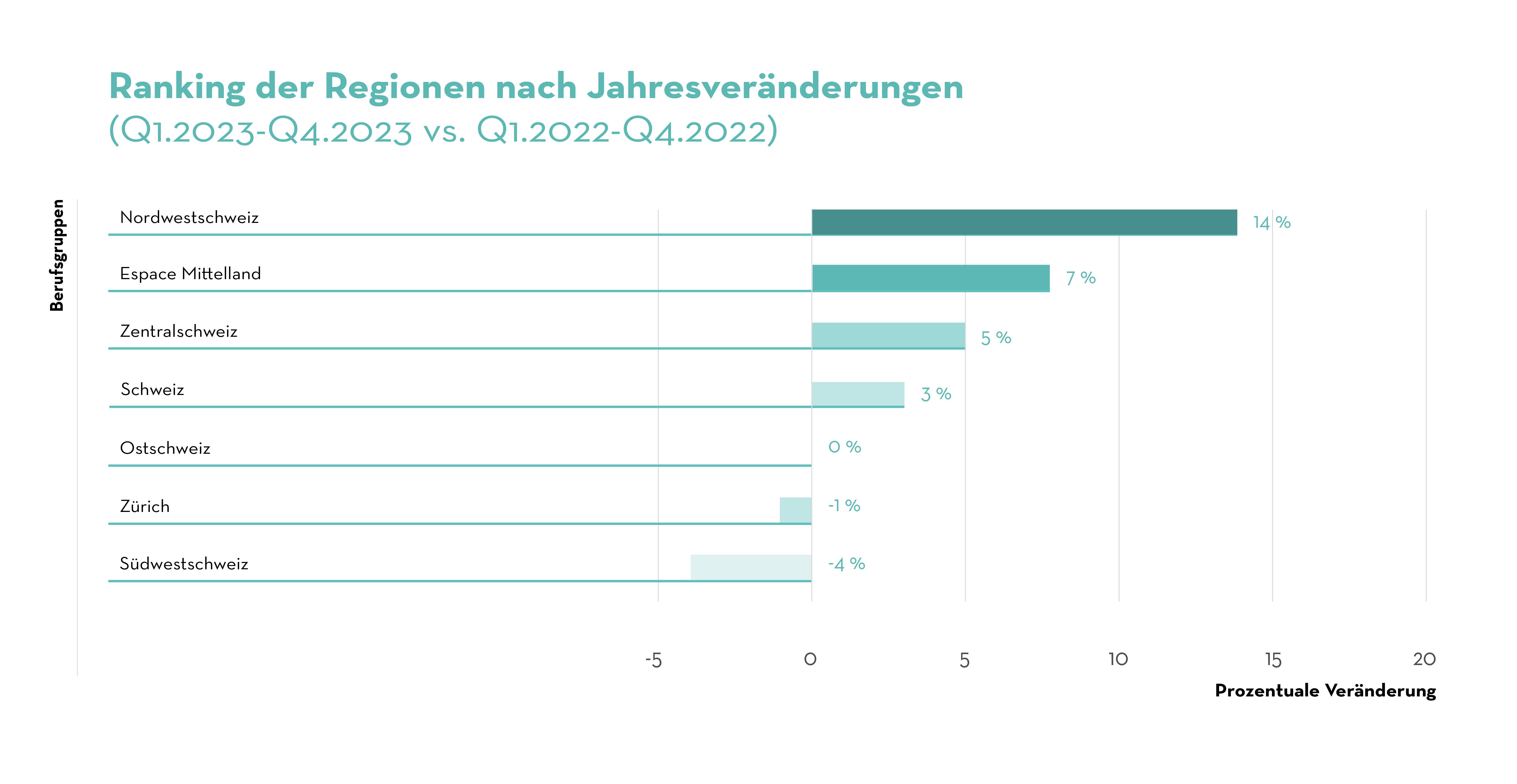 Während im Espace Mittelland und der Südwestschweiz insbesondere die Fachkräfte Technik (Espace Mittelland: +29%, Südwestschweiz: +15%) von einem Stellenwachstum profitieren, sind es in der Zentralschweiz und Zürich namentlich die Fachkräfte Handwerk und Hilfskräfte (Zentralschweiz: +32%, Zürich: +17%). In der Nordwestschweiz profitieren vorwiegend die Fachkräfte Dienstleistung und Verkauf, welche dieses Jahr 36% mehr Stellen verzeichnen als im Jahr 2022, während in der Ostschweiz die Führungskräfte von einem leichten Nachfrageschub von 3% profitieren.
