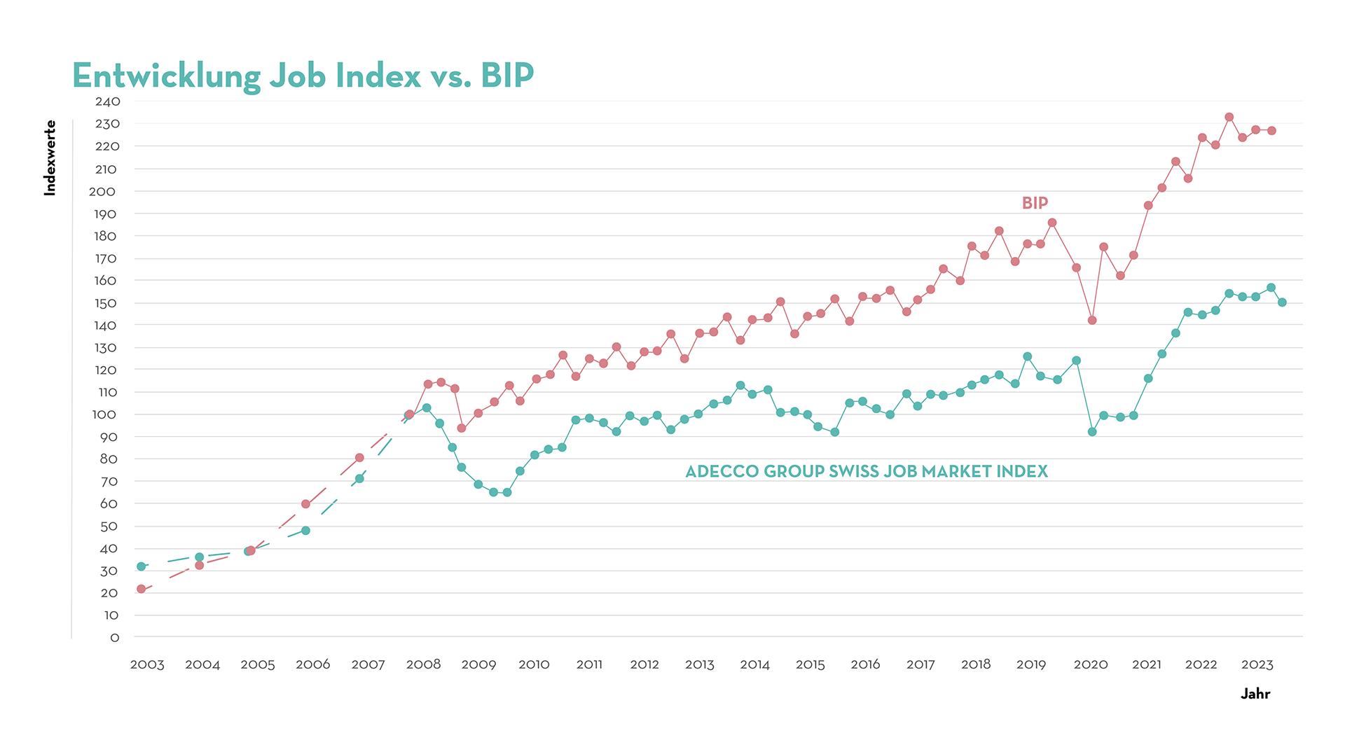 «Sowohl der Rückgang des Beschäftigungswachstums als auch der Anstieg der Arbeitslosenquote deuten auf eine Verlangsamung der Wachstumsdynamik am Schweizer Arbeitsmarkt hin. Der Adecco Swiss Job Market Index unterstreicht diese Entwicklung. Im Jahr 2023 ist der Stellenmarkt um lediglich 3% gewachsen. Trotz dieser Verlangsamung bleibt die Zahl der offenen Stellen weiterhin auf einem historisch hohen Niveau und die Arbeitslosenquote ist im Vergleich weiterhin relativ niedrig.»