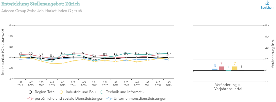 Zürich, 4. Oktober 2018 – Die Zahl der ausgeschriebenen Vakanzen bleibt im Grossraum Zürich im Vergleich zum Vorjahr nahezu unverändert (+1%). Damit liegt der Grossraum Zürich unter dem gesamtschweizerischen Durchschnitt von plus 6 Prozent. Insgesamt sind allerdings weiterhin knapp ein Drittel aller Stellen im Grossraum Zürich ausgeschrieben. Dies zeigt die wissenschaftlich fundierte Erhebung des Adecco Group Swiss Job Market Index des Stellenmarkt-Monitors der Universität Zürich. In einzelnen Berufsgruppen konnte jedoch ein leichter Anstieg der Personalnachfrage festgestellt werden.