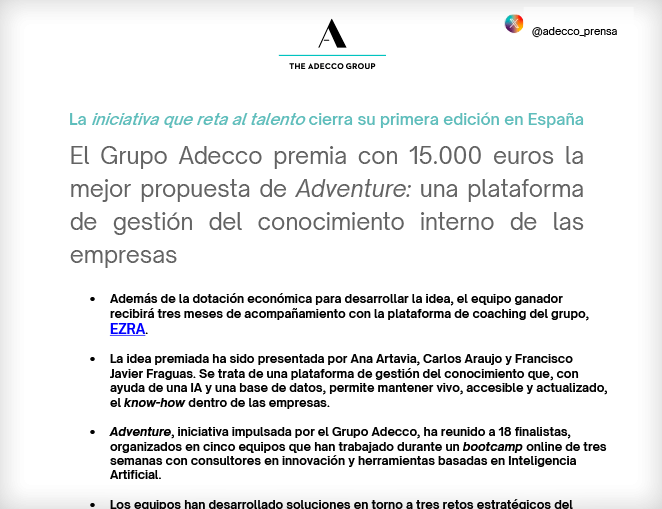 El Grupo Adecco premia con 15.000 euros la mejor propuesta de Adventure: una plataforma de gestión del conocimiento interno de las empresas