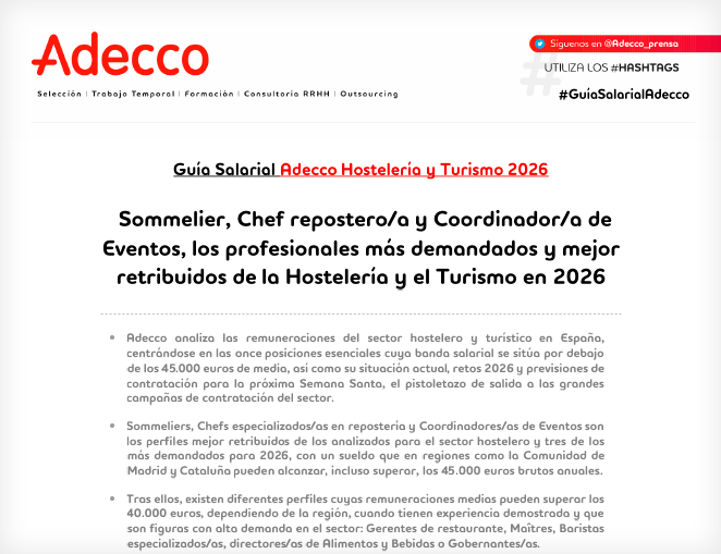 Sommelier, Chef repostero /a y Coordinador/a de Eventos, los profesionales más demandados y mejor retribuidos de la Hostelería y el Turismo en 2026