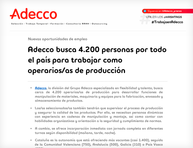 Adecco busca 4.200 personas por todo el país para trabajar como operarios/as de producción