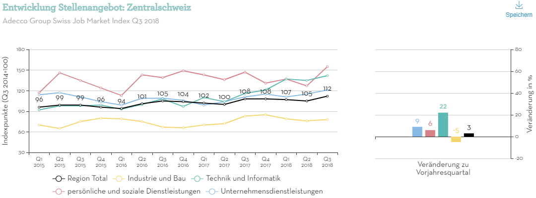 Zürich, 4. Oktober 2018 – Der Stellenmarkt in der Zentralschweiz entwickelt sich mit einem Plus von 3 Prozent im Vergleich zum Herbstquartal 2017 etwas unter dem gesamtschweizerischen Durchschnitt von 6 Prozent. Dies zeigt die wissenschaftlich fundierte Erhebung des Adecco Group Swiss Job Market Index des Stellenmarkt-Monitors der Universität Zürich. Überdurchschnittlich hoch ist der Anstieg bei der Personalnachfrage in den Berufen der Technik und Informatik.