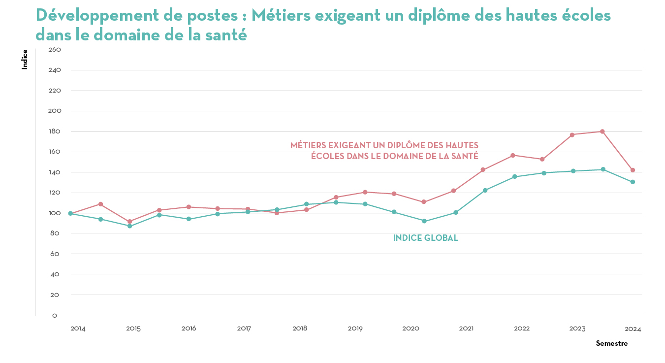 Cette évolution est d’autant plus surprenante que dans les années précédentes, les spécialistes des soins infirmiers avaient connu une hausse croissante de l’indice, avec un pic historique encore dernièrement, au second semestre 2023. Cette évolution pourrait être due au fait que de nombreux hôpitaux rencontrent depuis peu des difficultés financières. Les hôpitaux de Saint-Gall, par exemple, ont annoncé à l’automne dernier des suppressions de postes intervenant dans le cadre d’un programme d’assainissement financier. Les postes en question concernaient entre autres les spécialistes des soins infirmiers.