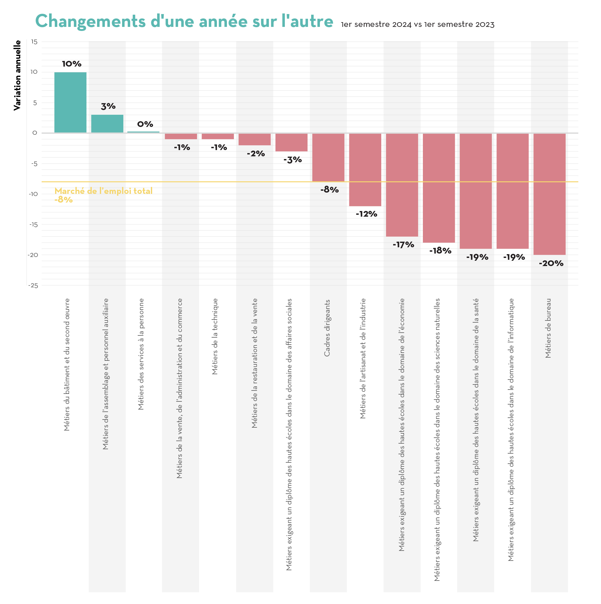 « Début 2023, le carnet de commandes dans le bâtiment a atteint un niveau record. Aujourd’hui, les contrats correspondants permettent d’amortir légèrement la baisse actuelle de l’activité et de stabiliser la demande dans les métiers du bâtiment. C’est tout l’inverse pour les métiers exigeant un diplôme des hautes écoles et les métiers de bureau. Bon nombre de ces métiers sont habituellement recherchés dans des branches actuellement confrontées à des difficultés, par exemple l’industrie. »