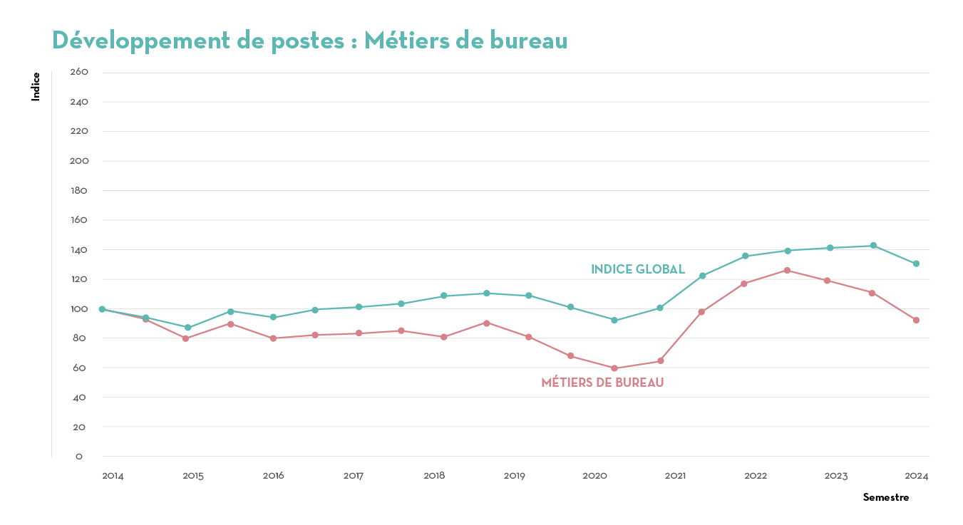- Métiers de bureau (à savoir, entre autres : secrétaires, guichetiers, chargés de traitement) : -20%
