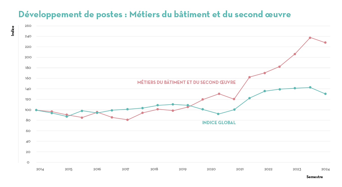 En ce moment, les métiers du bâtiment et du second œuvre enregistrent certes une hausse de 10% des postes vacants par rapport au premier semestre de l’année précédente, mais par rapport au second semestre 2023, le nombre de postes à pourvoir a diminué de 4%. C’est donc la fin provisoire de la forte tendance à la croissance enregistrée par ce secteur professionnel depuis 2021.