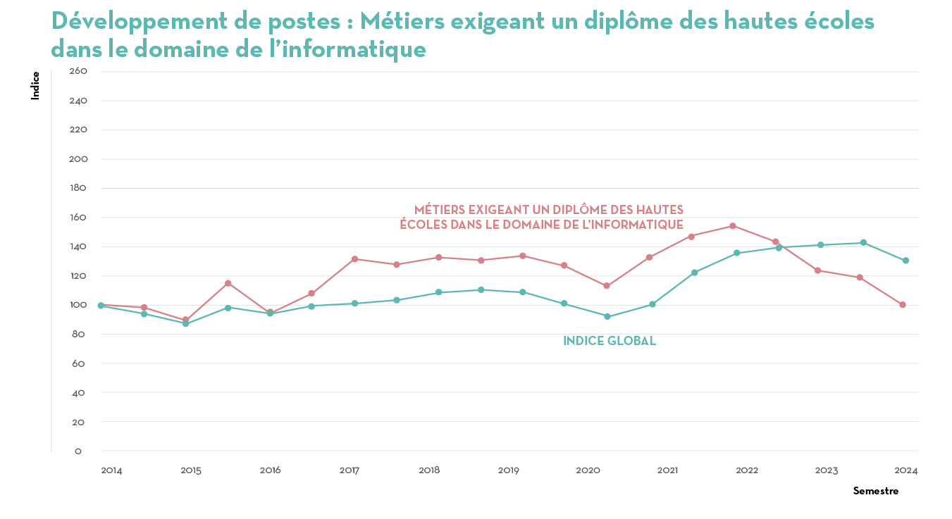 Désormais pourtant, les spécialistes des technologies de l’information et de la communication, des bases de données et des réseaux font face eux aussi à une chute de la demande ce semestre. À l’heure actuelle, l’indice pour les métiers exigeant un diplôme des hautes écoles dans le domaine de l’informatique atteint un nouveau plancher, en dessous duquel il n’était pas tombé depuis le second semestre 2016.