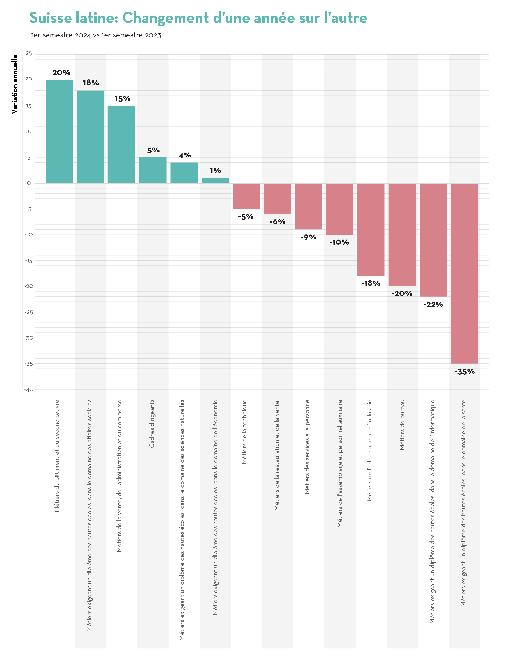 - En Suisse latine, le bilan est meilleur qu’au niveau national : dans 6 catégories professionnelles, le nombre d'offres d'emploi continue d'augmenter. En tête, on trouve les métiers du bâtiment et du second œuvre (+20% contre +10% au niveau national), suivis par les métiers exigeant un diplôme des hautes écoles dans le domaine des affaires sociales (+18% vs. -3%), qui comprennent par exemple les enseignants, les juristes ou les sociologues.