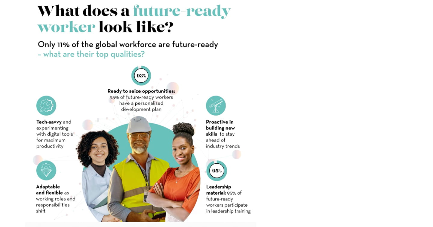 According to our research future-ready workers currently represent only 11% of the global workforce, yet they are outperforming their peers by a wide margin. Equipped with skills that allow them to adapt to change, these employees exhibit three core qualities:- Adaptability: They readily adjust to new tools, processes, and responsibilities, maintaining flexibility in the face of shifting demands.