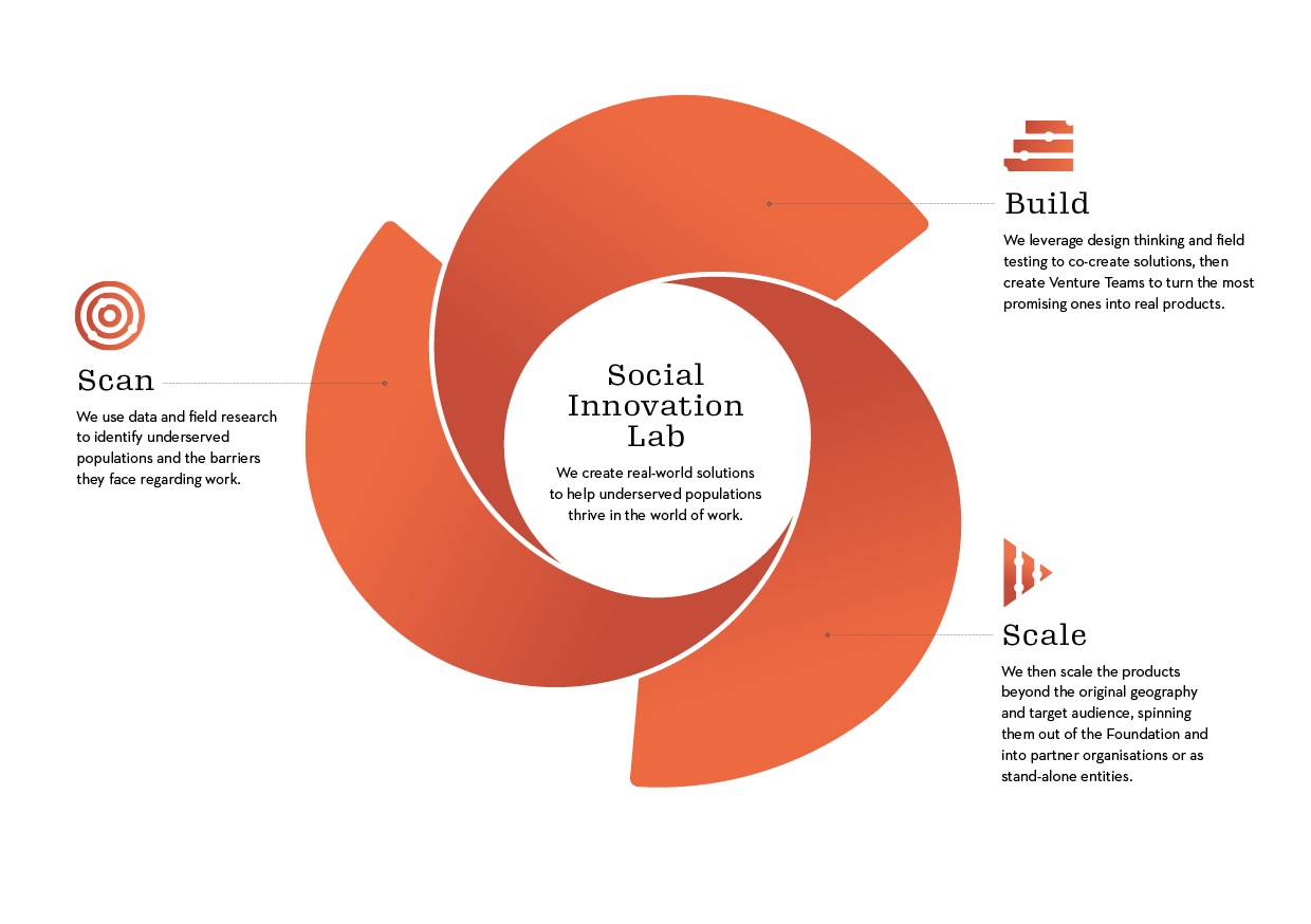We create products, services, and ways of working that are designed to identify and remove the barriers for underserved populations to thrive in the working world.