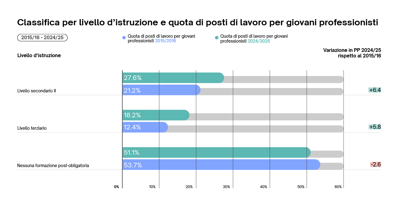 Uno sguardo ai requisiti formativi per le posizioni entry-level rivela interessanti differenze. La maggioranza dei posti di lavoro, che non presuppongono una formazione post-obbligatoria sono posti di lavoro entry-level (51,1%). Tuttavia, dal 2015/16, la percentuale di queste posizioni è leggermente diminuita (-2.6 PP), evidenziando una crescente domanda di persone al primo impiego più qualificate. Allo stesso tempo, la percentuale di posti di lavoro entry-level che richiede un diploma di livello secondario II (ad es. apprendistato o scuola media) è aumentata di 6.4 punti percentuali, raggiungendo un totale del 27,6% nel 2024/25. Lo stesso vale per le posizioni che richiedono una formazione terziaria (ad es. diploma di scuola universitaria o universitaria professionale), dove la percentuale di posizioni entry-level è aumentata di 5.8 punti percentuali al 18,2%.