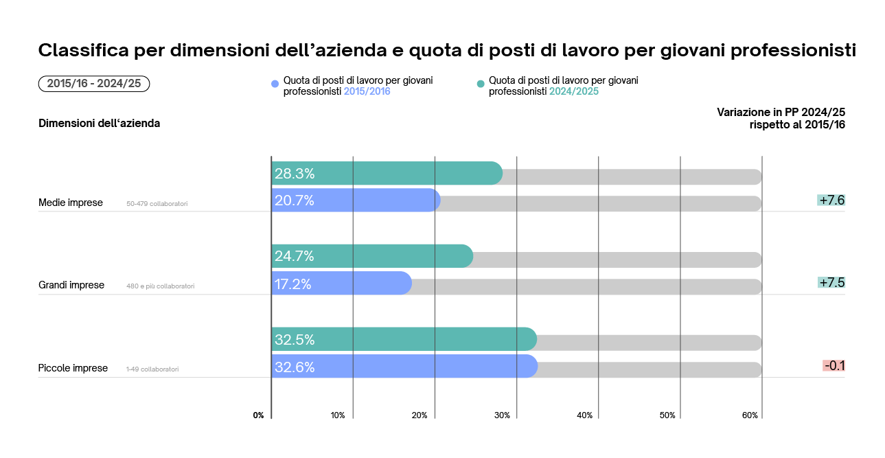 Le piccole imprese offrono la percentuale più alta di posizioni entry-level nel 2024/25 (32,5%), anche se in realtà essa è leggermente diminuita rispetto al 2015/16 (-0.1 PP). Le imprese di medie e grandi dimensioni, invece, mostrano incrementi significativi nelle posizioni entry-level (rispettivamente +7.6 e +7.5 PP), anche se la loro quota è complessivamente inferiore nel 2024/25 (rispettivamente 28,3% e 24,7%). Di conseguenza, reclutano sempre più giovani professionisti al primo impiego. Ciò potrebbe essere sempre più legato a una carenza di lavoratori qualificati, soprattutto nelle medie imprese.
