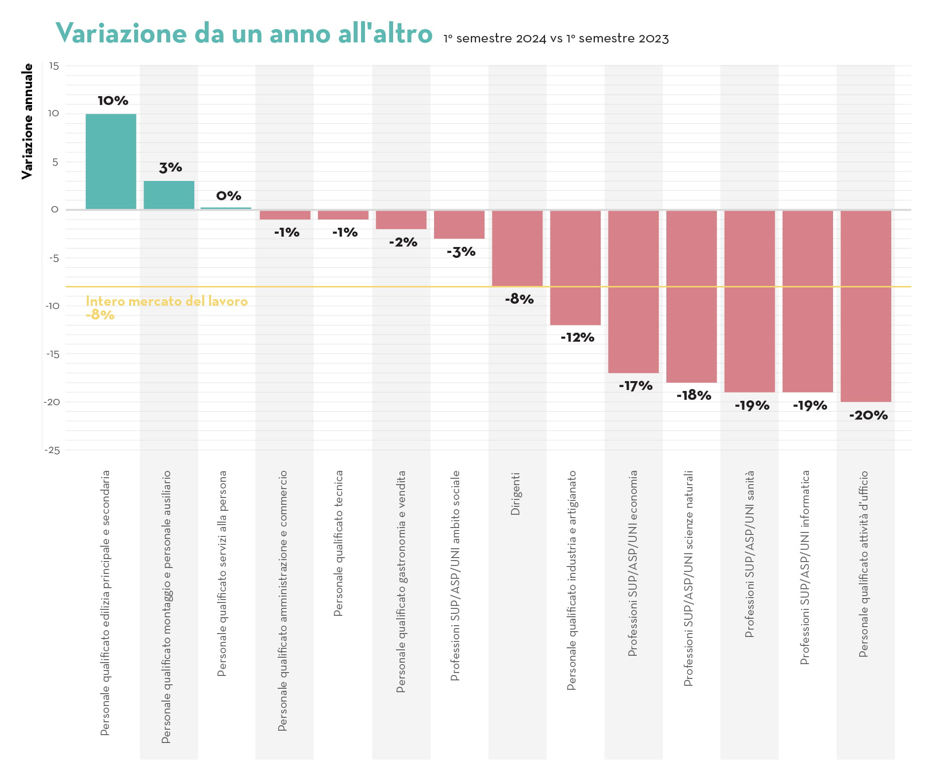 Altrettanto degno di nota il fatto che la flessione della domanda interessi in modo particolare le professioni SUP/ASP/UNI. Così, oltre alla categoria Professioni SUP/ASP/UNI sanità (ad. es. personale medico specialistico, ergoterapisti o personale infermieristico qualificato), anche le categorie Professioni SUP/ASP/UNI informatica (ad. es. analisti di sistema, programmatori di applicazioni o amministratori di sistema), Professioni SUP/ASP/UNI scienze naturali (ad. es. fisici, chimici o ingegneri) e Professioni SUP/ASP/UNI economia (ad es. specialisti in ambito finanziario, consulenti aziendali o specialisti in marketing) sono interessate da uno sviluppo occupazionale sensibilmente negativo.