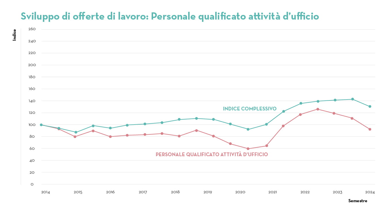 Dopo che la categoria Personale qualificato attività d’ufficio aveva toccato un numero record di posti vacanti nella seconda metà del 2022 sulla scia della ripresa economica legata alla pandemia, nel semestre successivo, con il crescente rallentamento dell’economia, si era già instaurato un trend negativo che persiste tuttora. Attualmente il personale qualificato attività d’ufficio, di cui fanno parte gli impiegati di segreteria, impiegati contabili e i funzionari agli sportelli, registra un calo del 20% negli annunci di lavoro rispetto alla prima metà del 2023.