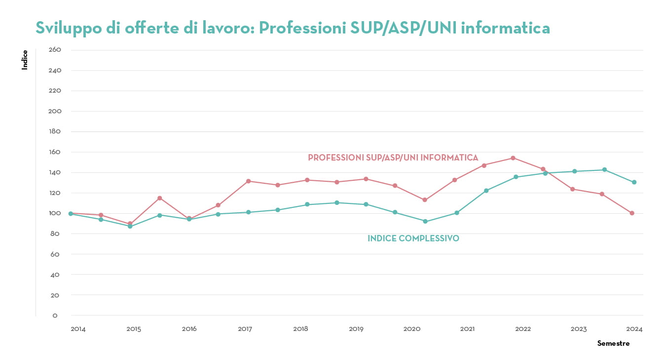 Dalla seconda metà del 2022 le professioni SUP/ASP/UNI informatica registrano un trend negativo nello sviluppo occupazionale. Questa tendenza si riconferma anche in questo semestre, che vede un 19% in meno di annunci di lavoro rispetto al primo semestre del 2023. Una possibile spiegazione per il calo dell’offerta di posti di lavoro potrebbe essere l’aumento dei costi dei progetti IT dovuto agli alti tassi di interesse e la debole congiuntura economica che ostacola i piani di investimento, entrambi fattori che hanno un impatto negativo sulla domanda di specialisti IT.