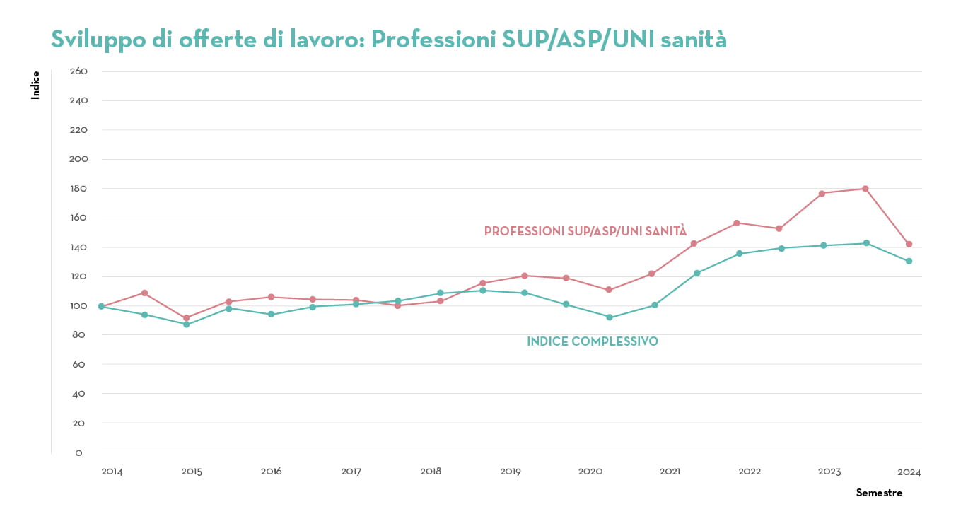 Nella prima metà del 2024, per la prima volta da anni, si è osservato un calo significativo dei posti vacanti nella categoria professioni SUP/ASP/UNI sanità. Rispetto alla prima metà del 2023 questa categoria professionale registra una flessione degli annunci di lavoro pubblicati del 19%. Tutte le sottocategorie di questa categoria professionale registrano una diminuzione dei posti vacanti, in particolare la sottocategoria degli infermieri qualificati.
