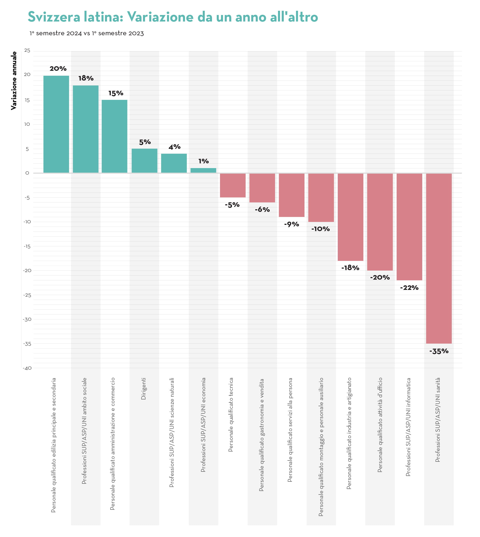- Nella Svizzera latina, il bilancio è migliore rispetto al livello nazionale: in 6 categorie professionali, il numero di offerte di lavoro continua ad aumentare. In cima ci sono il personale qualificato edilizia principale e secondaria (+20% rispetto al +10% nazionale), seguito dalla categoria professioni SUP/ASP/UNI ambito sociale (+18% vs. -3%), che include ad esempio insegnanti, giuristi o scienziati sociali.