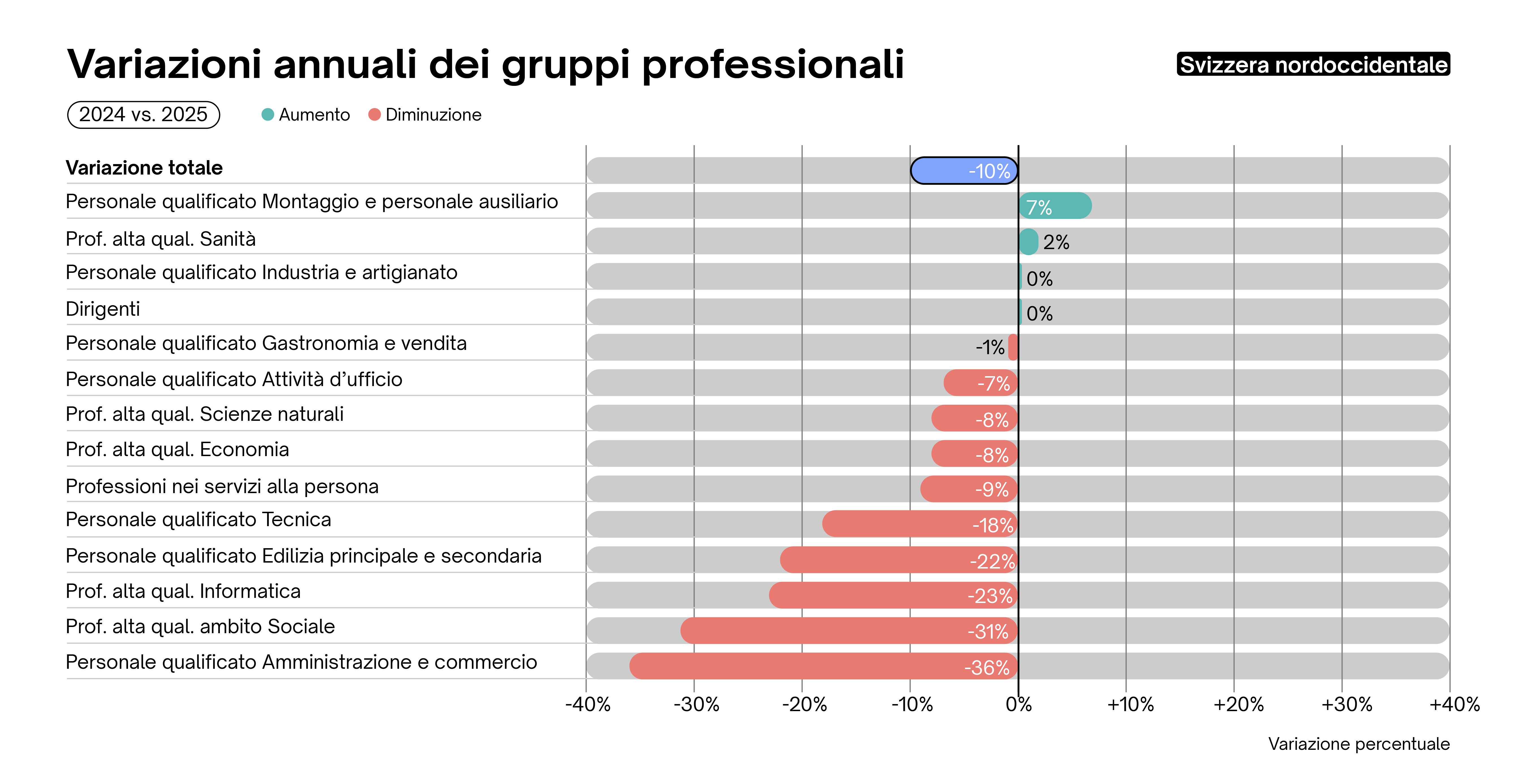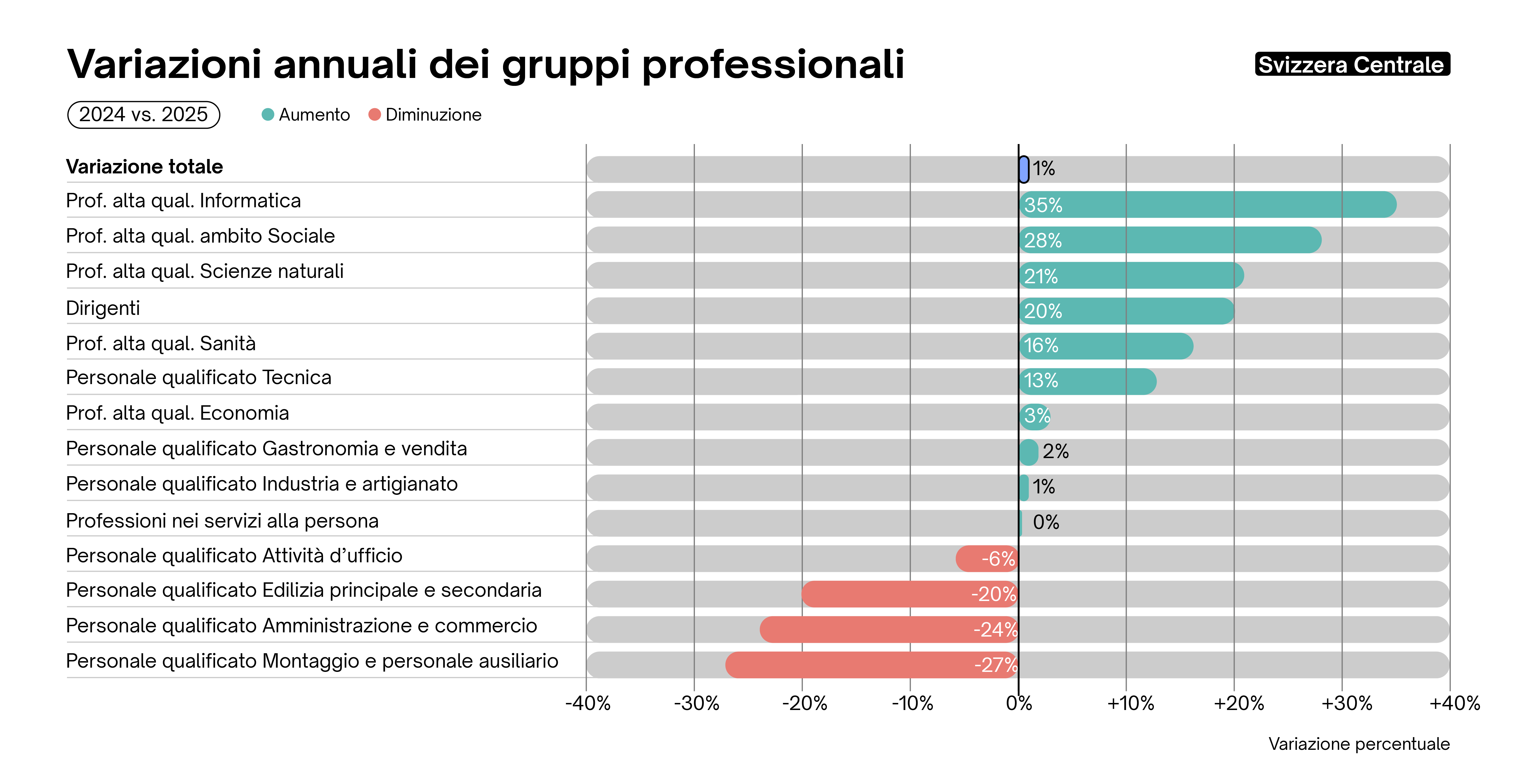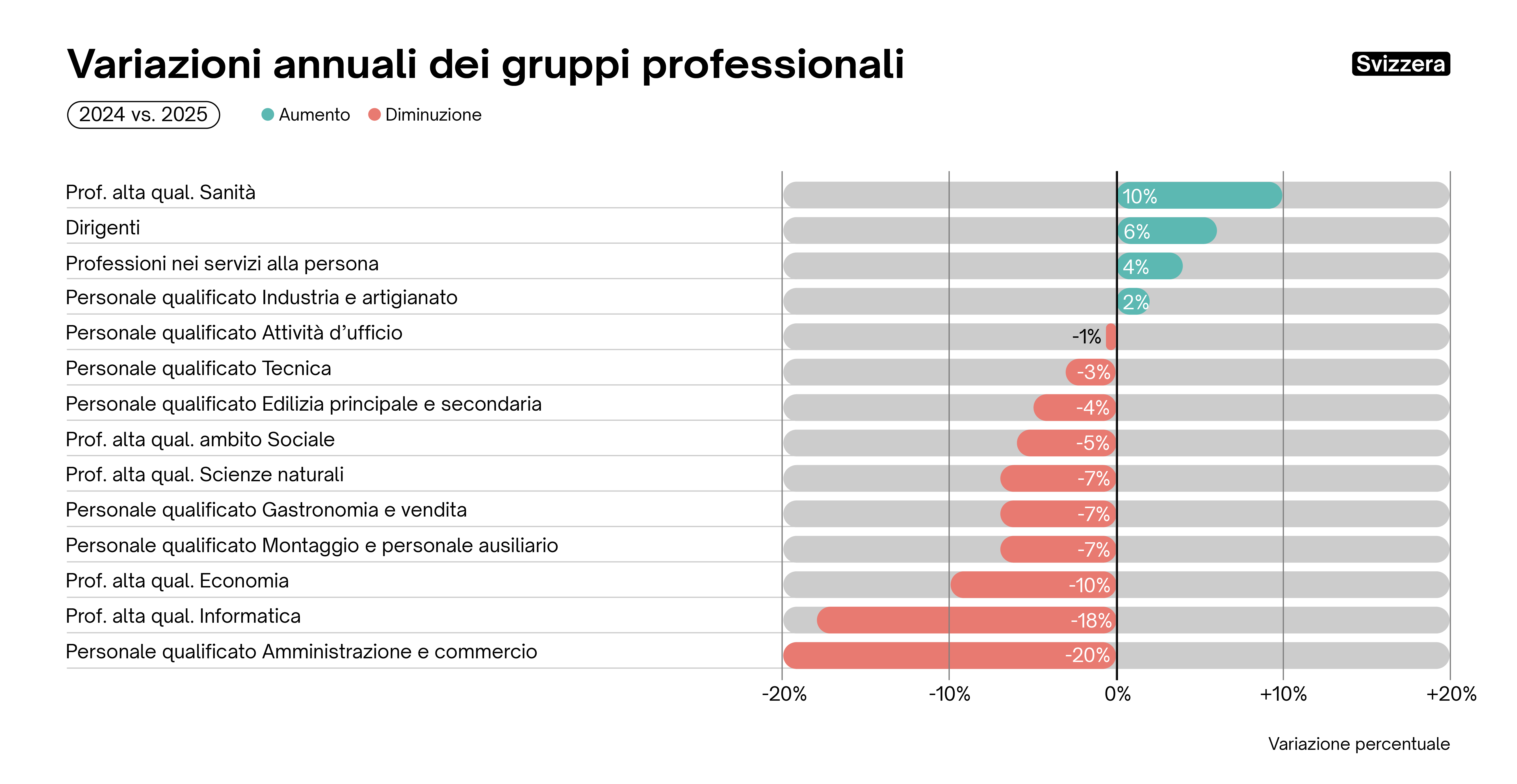 L'Adecco Group Swiss Job Market Index registra un leggero aumento dell'1,8% dei posti vacanti rispetto al trimestre precedente (T3 2025) e un moderato incremento del 2,4% rispetto allo stesso trimestre dell'anno precedente (T4 2024). Ciò indica, nella migliore delle ipotesi, una leggera stabilizzazione del mercato del lavoro in tempi di incertezza economica, come suggerisce anche il moderato aumento dell'indicatore KOF dell'occupazione dell'ETH di Zurigo. Ciò significa che un numero maggiore di aziende prevede di aumentare il personale piuttosto che ridurlo. Nel complesso, tuttavia, le prospettive occupazionali rimangono modeste.