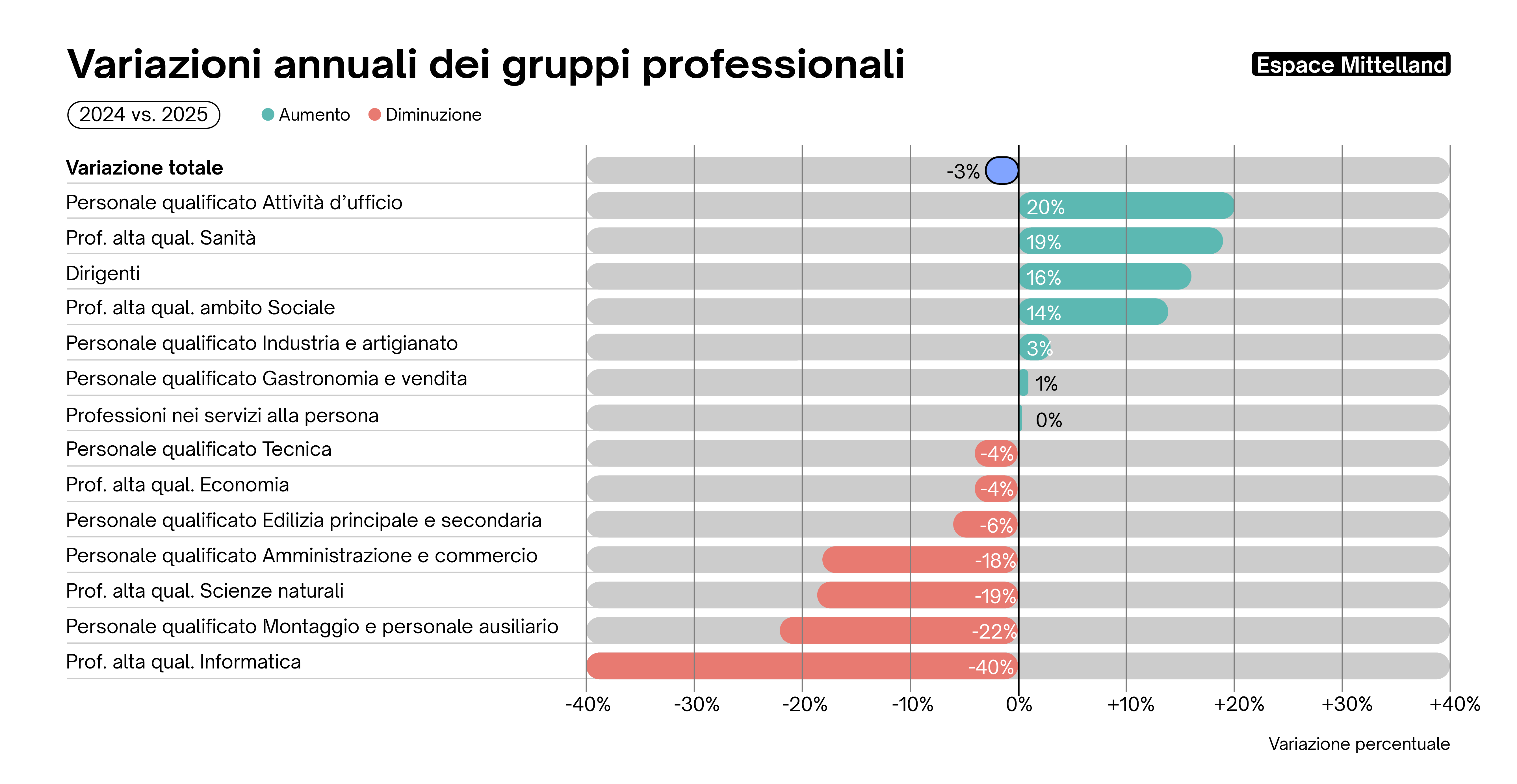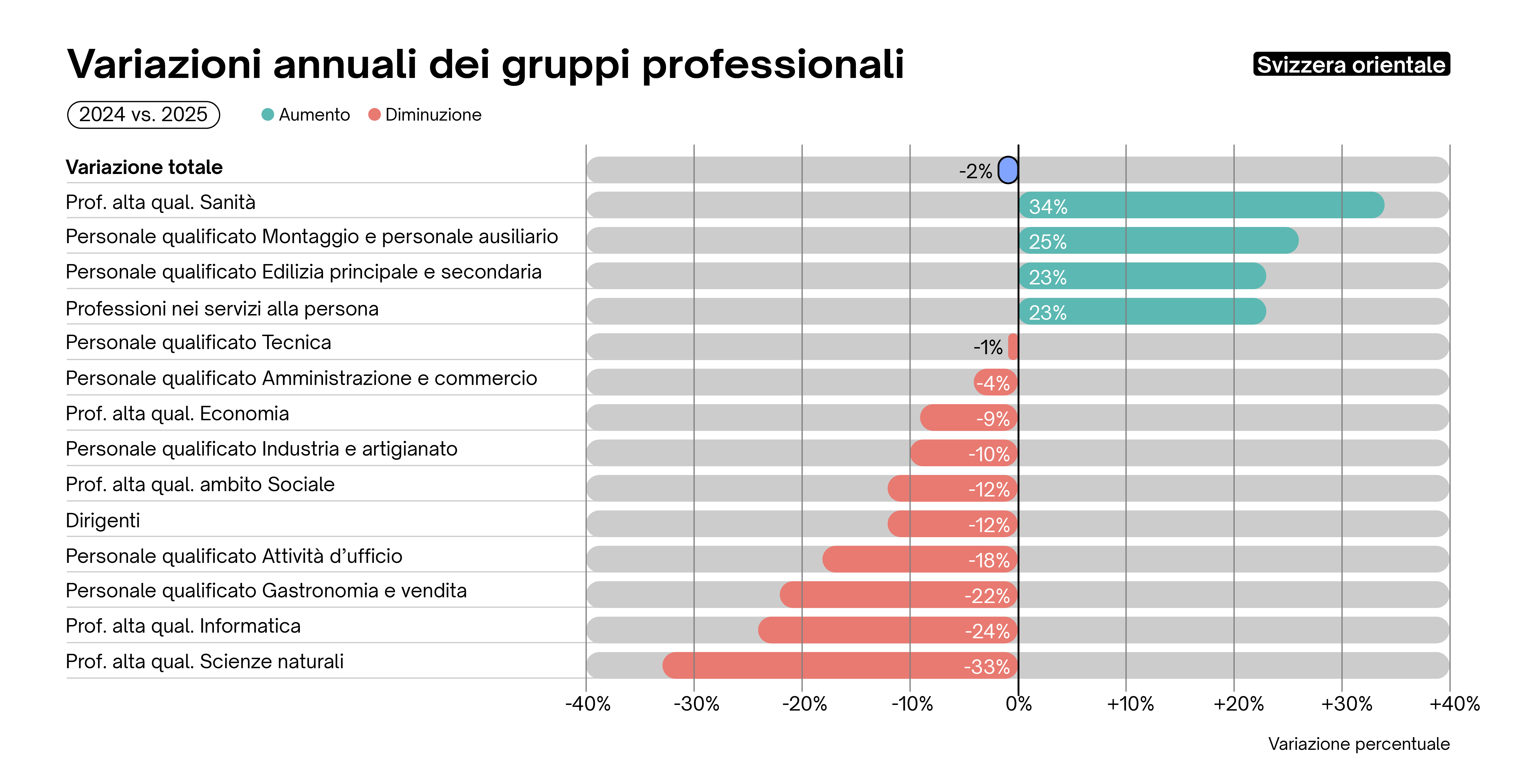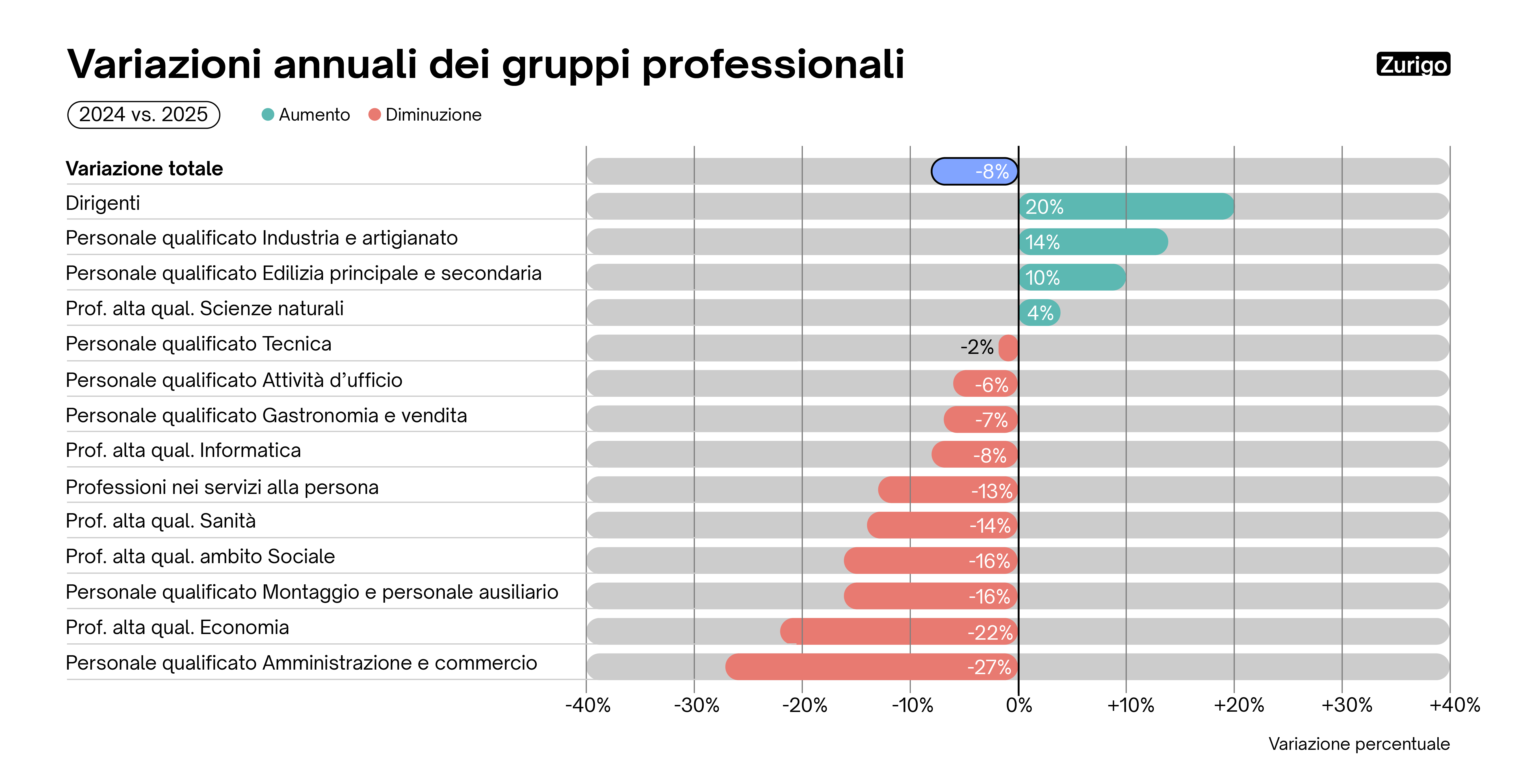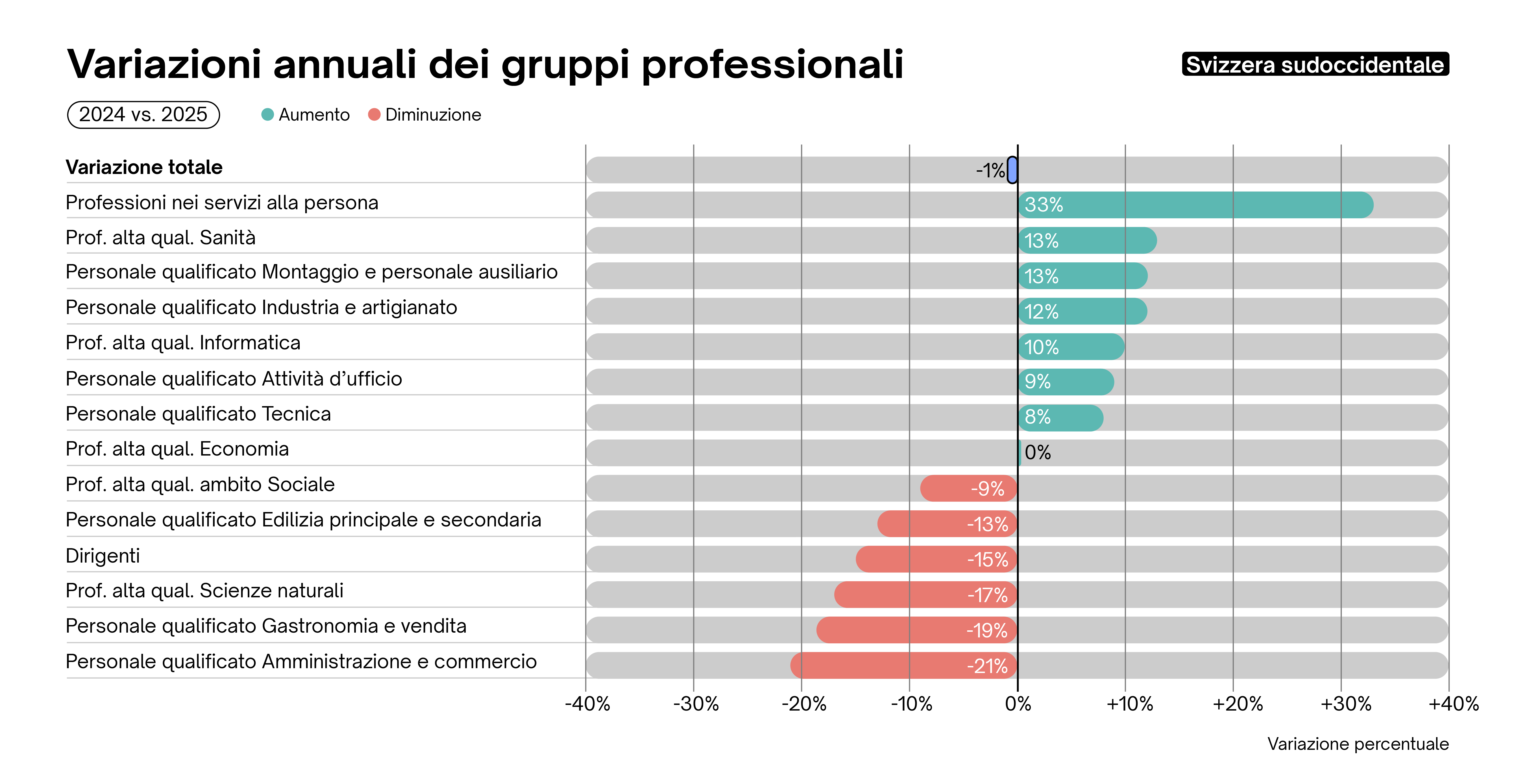 L'Adecco Group Swiss Job Market Index registra un leggero aumento dell'1,8% dei posti vacanti rispetto al trimestre precedente (T3 2025) e un moderato incremento del 2,4% rispetto allo stesso trimestre dell'anno precedente (T4 2024). Ciò indica, nella migliore delle ipotesi, una leggera stabilizzazione del mercato del lavoro in tempi di incertezza economica, come suggerisce anche il moderato aumento dell'indicatore KOF dell'occupazione dell'ETH di Zurigo. Ciò significa che un numero maggiore di aziende prevede di aumentare il personale piuttosto che ridurlo. Nel complesso, tuttavia, le prospettive occupazionali rimangono modeste.