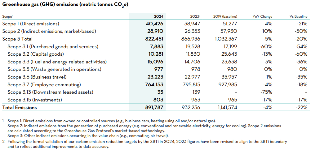 Since then, we invested substantial capacity to update our emissions inventory to close existing data gaps and include additional emissions sources not previously measured, such as e.g., the commuting of our people and strategic data centres, and to cover the full scope of entities under our operational control. We then recalculated the emissions data for previous years to align with the new SBTi methodology and boundaries. We also aligned on 2019 as our new baseline year, given that the years 2020-2022 would not be indicative of our footprint due to the impact of Covid-19 pandemic measures such as office closures and travel restrictions.