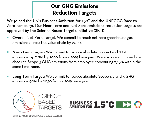 Managing our own environmental footprint – Guided by climate science: We are conscious of the environmental impact our operations can have and the difference we are able to make by acting responsibly.  In 2022, we formally committed to the Science-Based Targets initiative and to set net-zero targets, and thereby became part of the Business Ambition for 1.5°C and the Race to Zero campaigns.