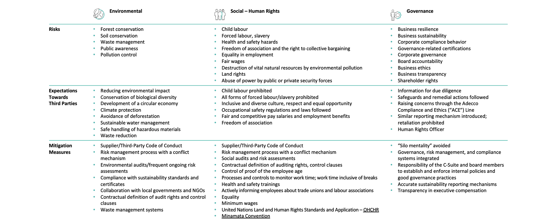 - Measure, control and monitor: suppliers can be involved in several evaluation rounds to ensure continuous evaluation and to be able to continuously mitigate risks. Changes in the supplier profile, the relationship or, for example, regulatory changes can trigger a reassessment. Our supplier portfolio is continuously monitored to ensure that commitments are met and that The Adecco Group and its stakeholders are not exposed to undesirable risks.